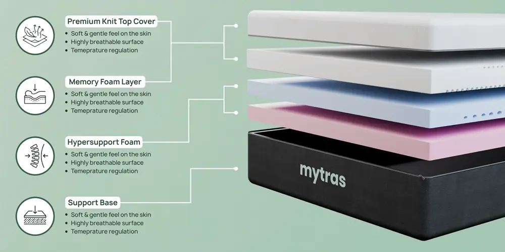 Upgrade your sleep with the Mytras Mattress—where thoughtful design meets everyday comfort. Crafted with premium materials and advanced foam layers, it delivers balanced support, pressure relief, and reliable performance for restful sleep, night after night. Backed by a 3-year warranty for added peace of mind.